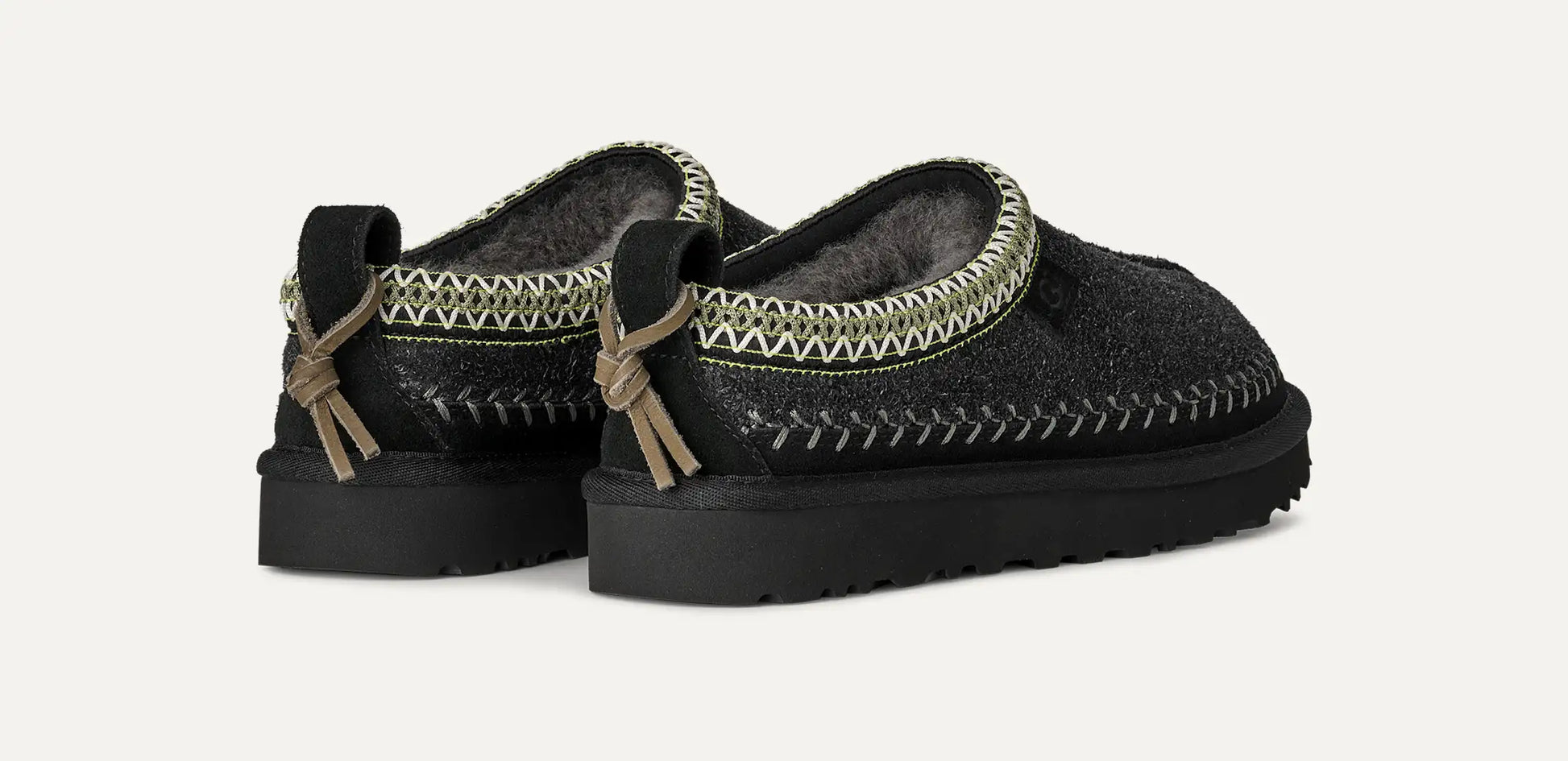 - Garde-boue en daim, surpiqûres décoratives, tirant arrière, pampille en cuir, contrefort en daim, UGGbraid en fibres de polyester 100 % recyclé